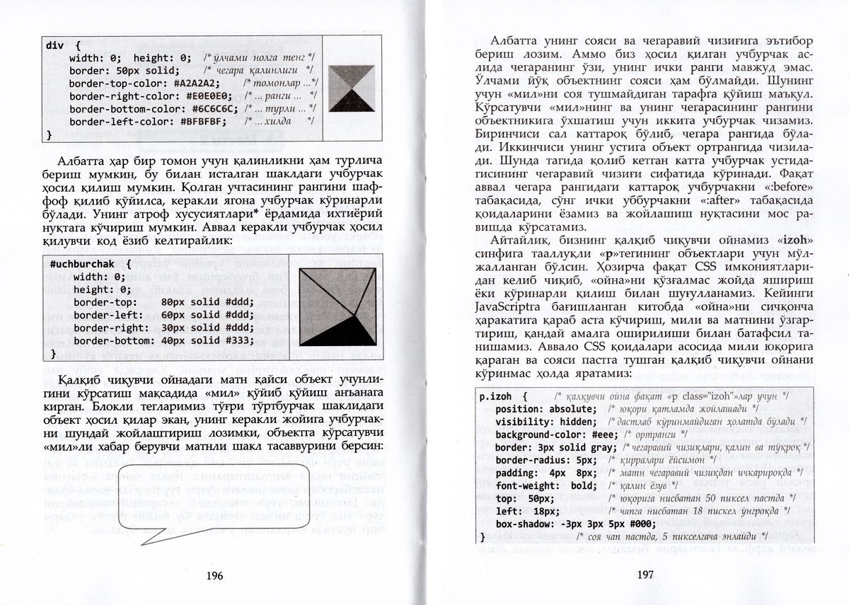 Китобда кодлар яққол ажратилиб, ҳосил бўладиган шакллар ҳам тасвирланган.