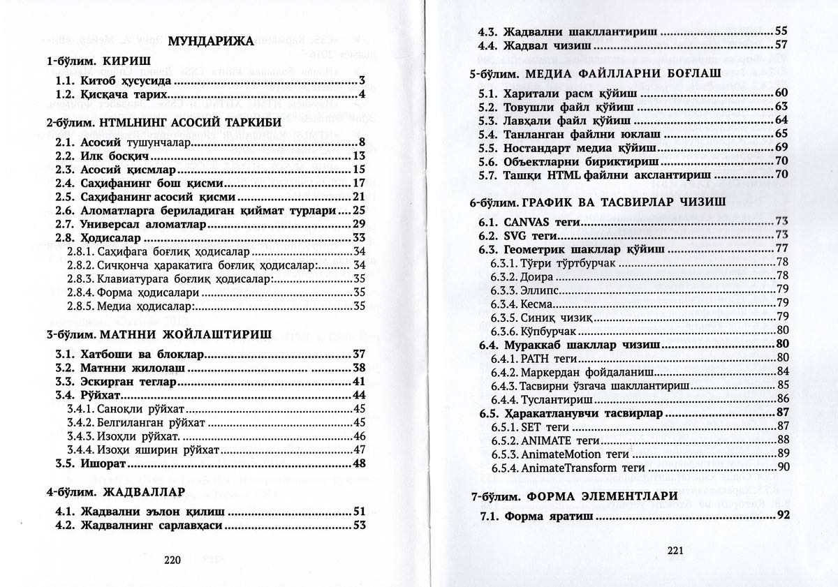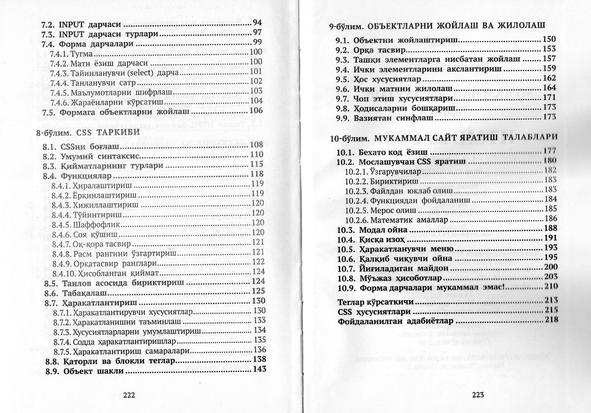Тўртинчидан, энг муҳими шуки, HTML ва CSS дастурлаш тили ҳисобланмаса ҳам, мукаммал дастурлаш учун (веб соҳасида) асосий илк қадам бўлганлиги боис, замонавий профессионал ёндашув бўйича ёритилган. Турлар алоҳида баён этилган. Керак жойларда ҳисоб-китоблар қандай амалга оширилиши мисоллар билан келтирилган.